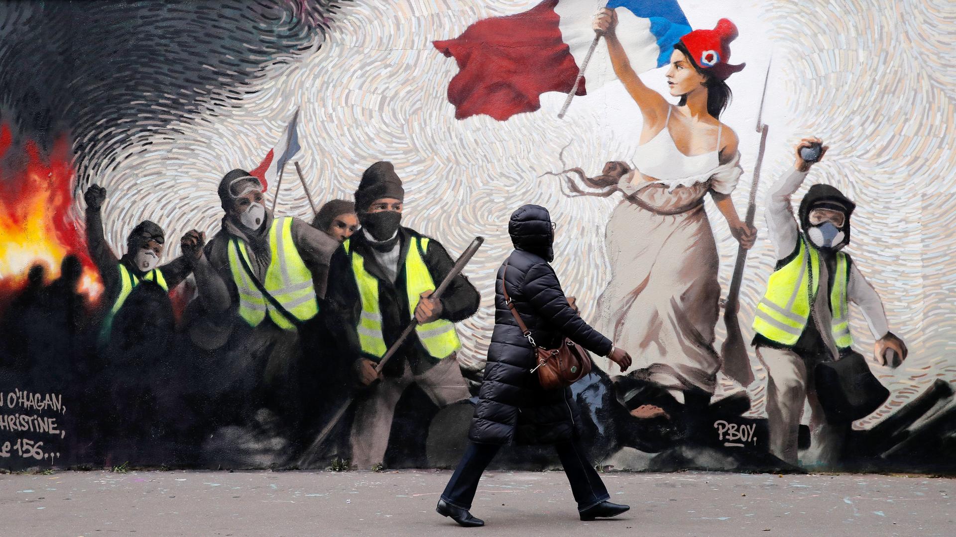 Eine Frau geht an einem Wandbild des Straßenkünstlers Pboy vorbei vorbei